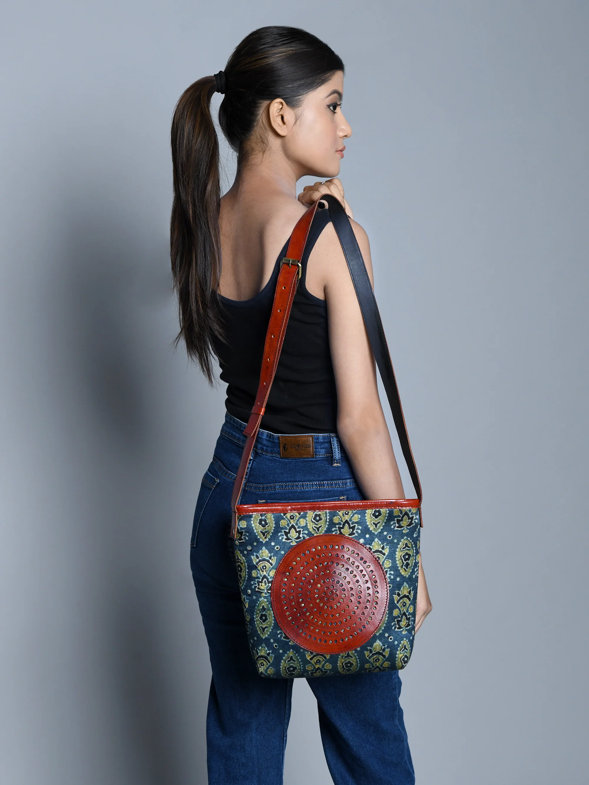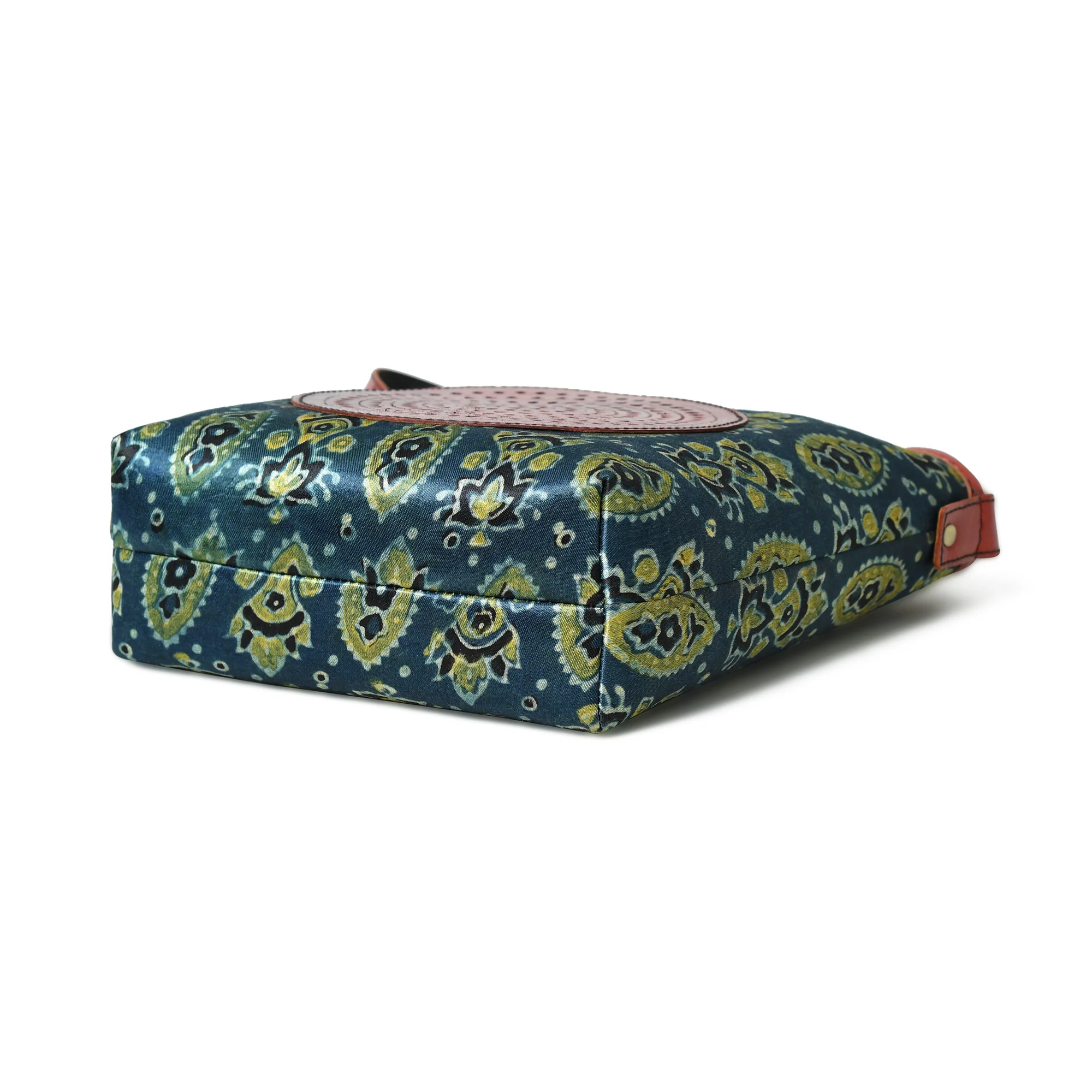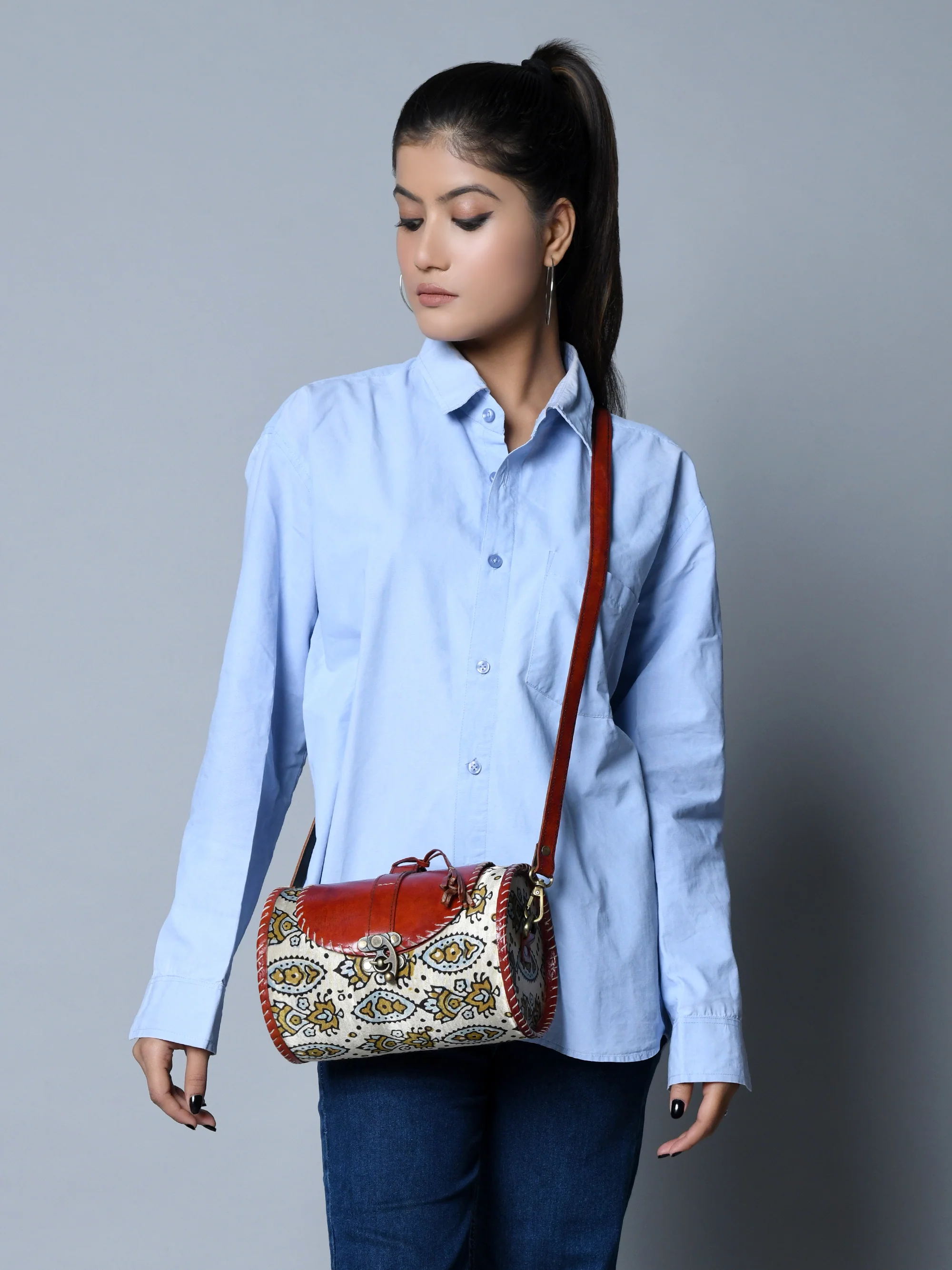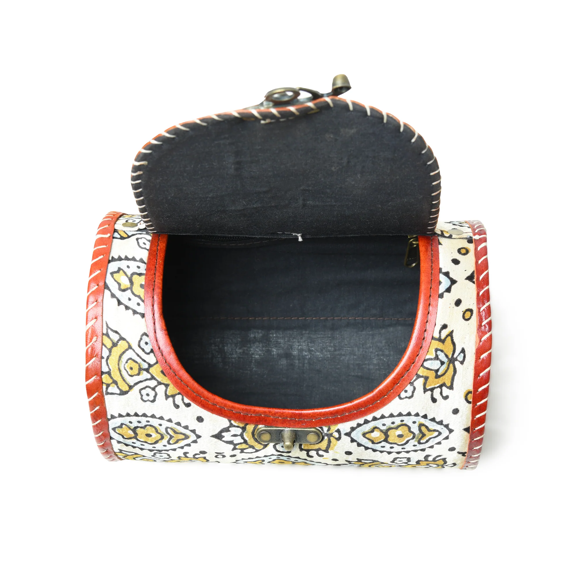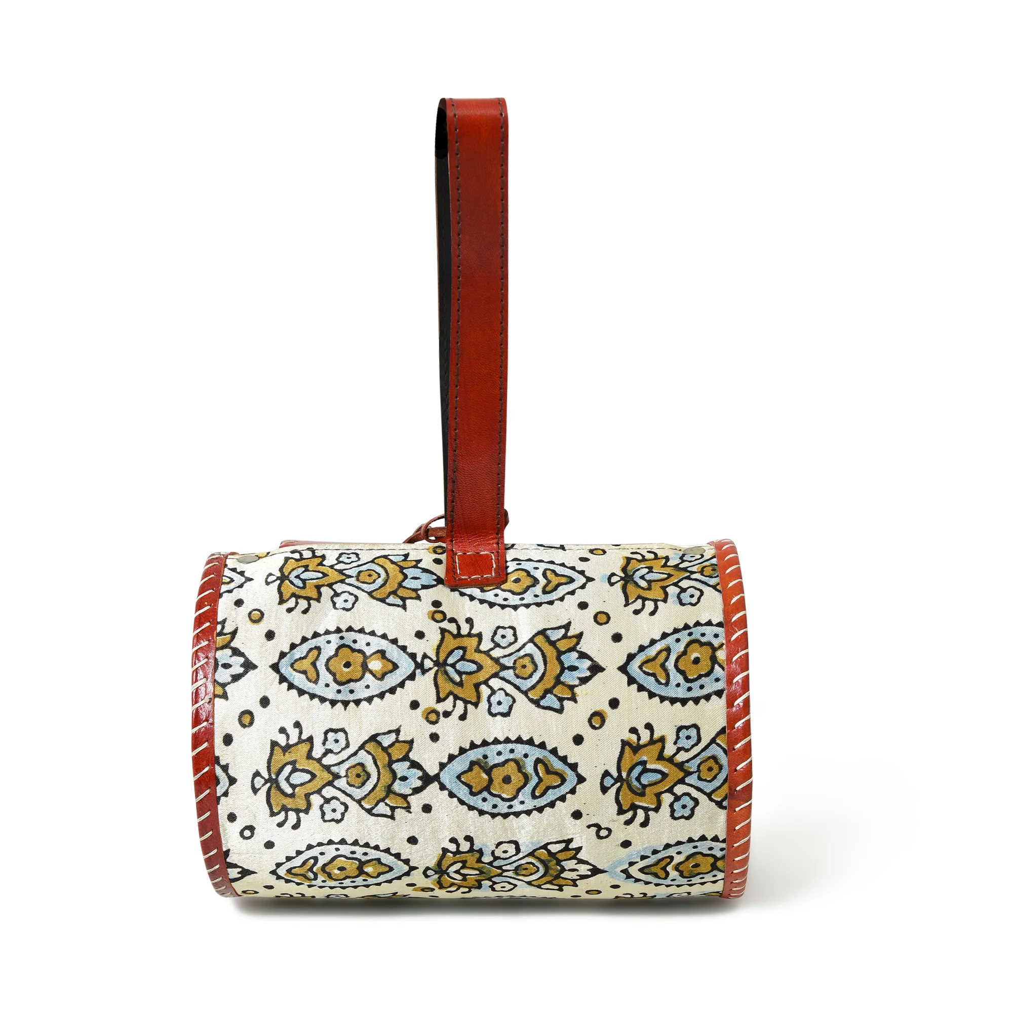 Cylindrical Block Printed Leather Bag